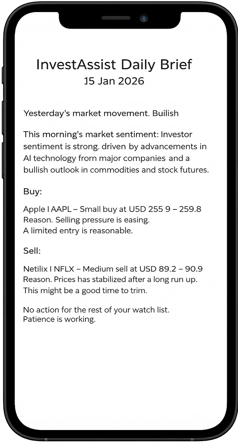 The Daily Brief (In Development)The plan: Every day before markets open, you'd get a clear brief analyzing your watchlist.The tool wouldn't predict where stocks are going. It would help you respond intelligently to where they've been—consistently, without the emotional baggage.No jargon. No hundred-page reports.Just what you'd need to make confident decisions. Takes 5 minutes to read.We're testing this approach through current research.